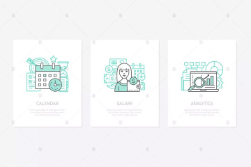 工资计算主题线条设计风格网站APP启动页插画。日历,工资,分析线性图标与文本空间。 财务管理信息图表设计元素。 投资,银行和账单分析。下载中包括可编辑的EPS10矢量和高品质的JPG文件。请注意,该文本不可编辑。