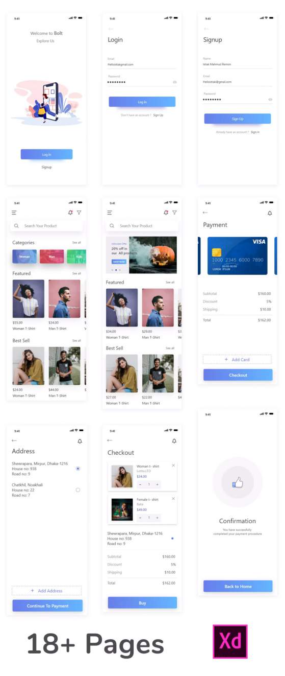 电子商务IOS App UI套件,包含18个页面,XD格式文件,干净简单的设计,易于使用。