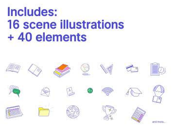 学校和在线教育矢量插画包。非常适合教育初创公司,在线课程,学校组织软件以及其他许多软件!可以轻松调整大小,并根据需要更改每种形状的颜色。该套件包括16个预制的场景插画和40个较小的元素,您可以将它们组合为无穷的构图。