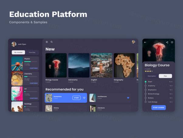 这是一个大型响应式ui设计套件,其中包含150多个用于深色和浅色主题的组件。该UI套件包括27个Web设计和APP应用设计示例页面,分别用于Messenger应用程序,博客,送餐服务和教育服务。UI Kit已在Figma中根据材料设计指南进行设计,并使用了自动布局功能。