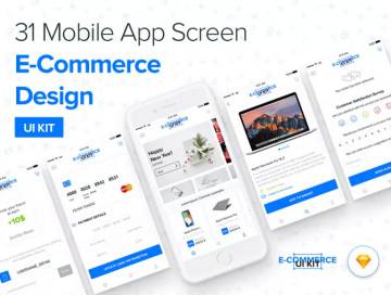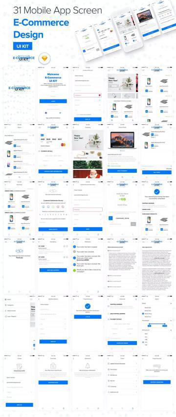 分享一款大气实用的电商类UI Kit打包下载[sketch],31个功能界面,分辨率为375x667px,内含矢量图标SVG,PNG,PSD,EPS,完全可编辑。