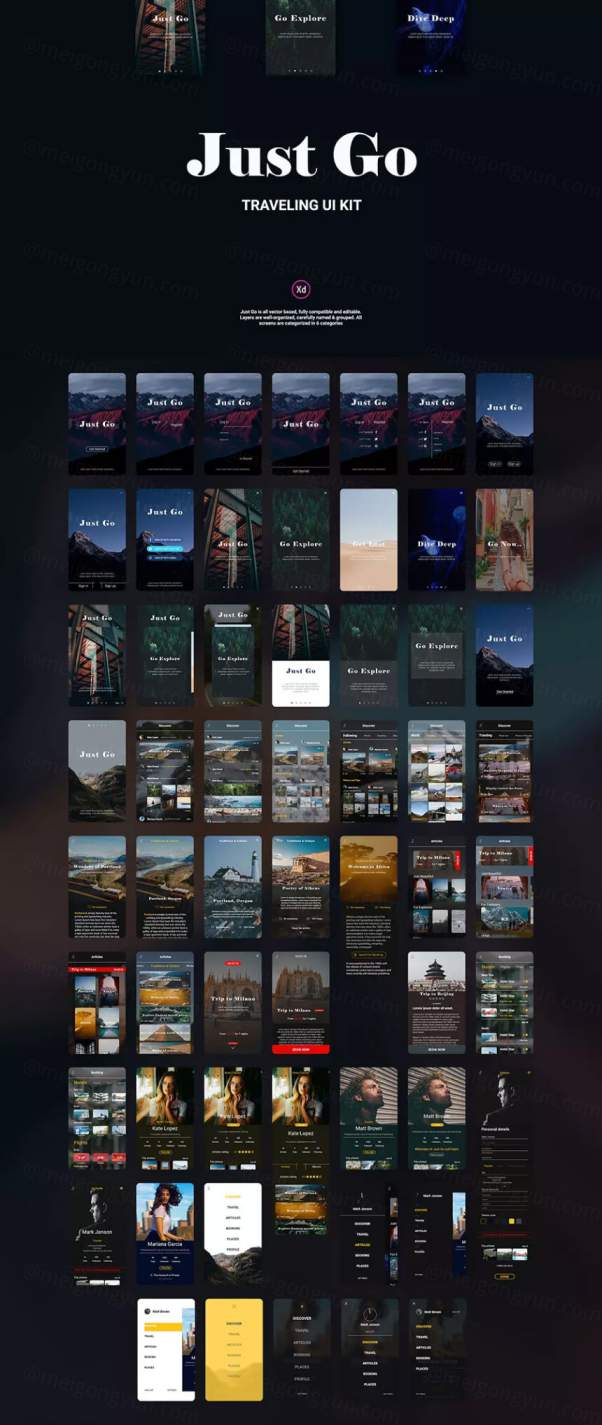 图穷联素材库 » 深色的世界名胜旅行类APP UI KITS套装[XD]