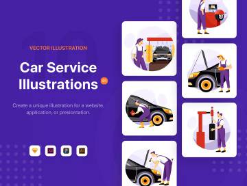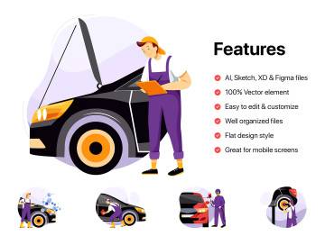 为网站、应用程序或演示文稿创建唯一的矢量插画。此汽车保养服务场景插画确实有助于移动和桌面UI以及创建所需的任何其他合成。它们有助于加快设计过程并使其更加美观。
