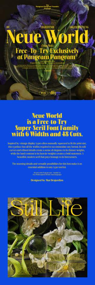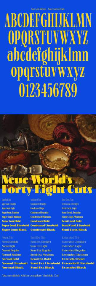 图穷联素材库 » 复古优雅感超级衬线英文字体全套下载 Neue World 48 Styles Variable Cut