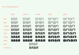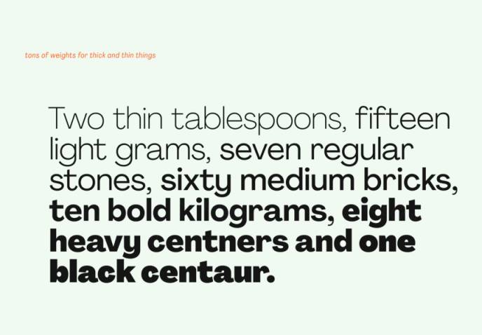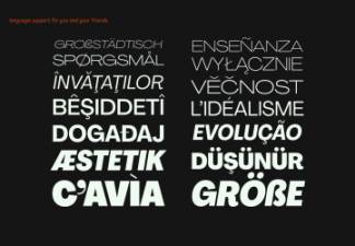 它旨在成为中性现代主义字体的勇敢对立面。字体系列由 74 种字体组成:14 个字重 × 5 个字宽 + 4 个额外的文本字重。